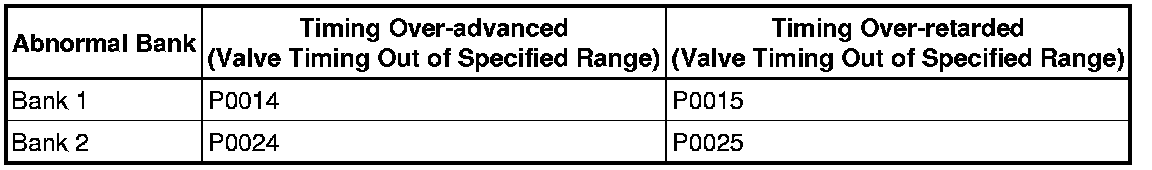 DTC P0014, P0015, P0024 or P0025 is stored when foreign objects in the engine oil are caught in some parts of the system. These codes will remain stored even if the system returns to normal after a short time. These foreign objects are then captured by the oil filter, thus eliminating the source of the problem.