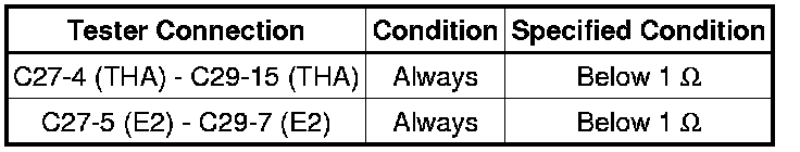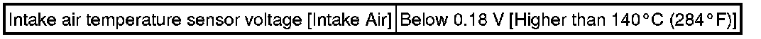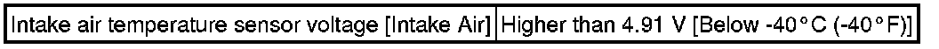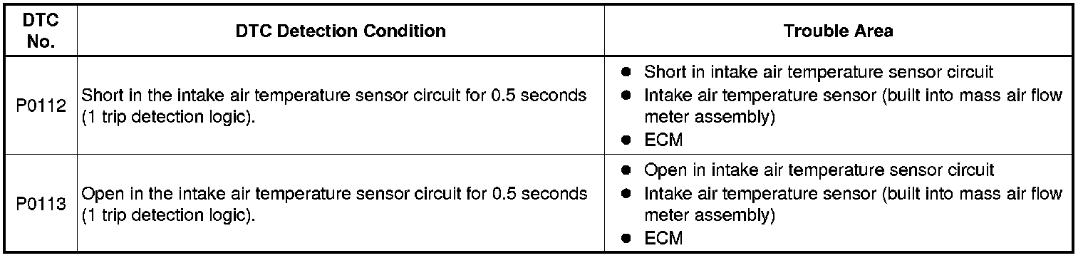 If the sensor output voltage is higher than 4.91 V for 0.5 seconds or more, the ECM determines that there is an open in the intake air temperature sensor circuit and stores DTC P0113. Conversely, if the output voltage is below 0.18 V for 0.5 seconds or more, the ECM determines that there is a short in the sensor circuit and stores DTC P0112.