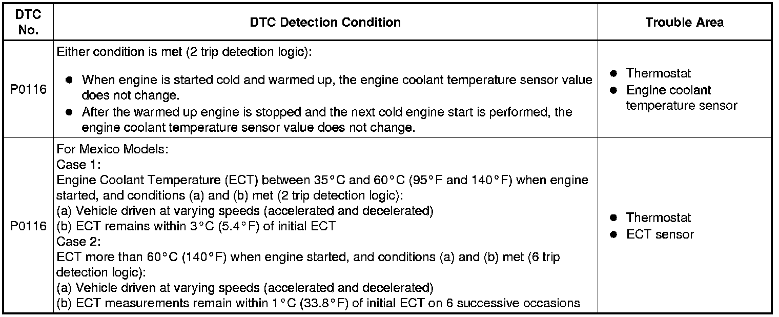 - If DTC P0115, P0117, P0118 or P0125 is stored simultaneously with DTC P0116, the engine coolant temperature sensor may have an open or short circuit. Troubleshoot those DTCs first.