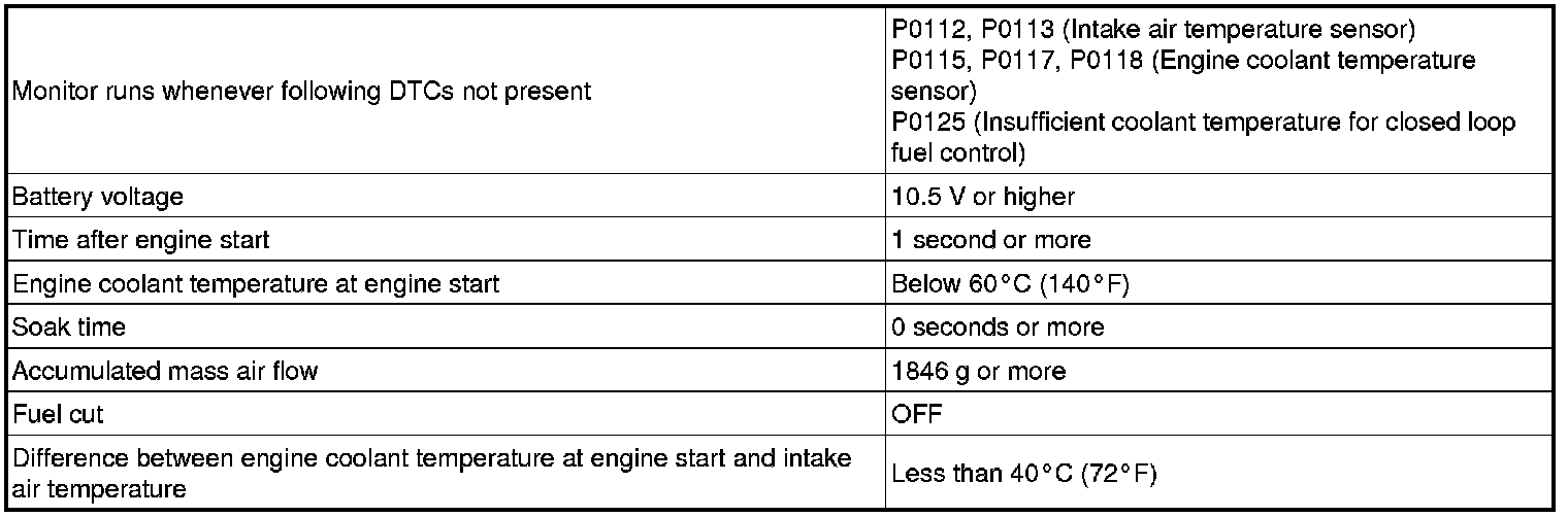 When a cold engine start is performed and then the engine is warmed up, if the engine coolant temperature sensor value does not change, it is determined that a malfunction has occurred. If this is detected in 2 consecutive driving cycles, the MIL is illuminated and a DTC is stored.