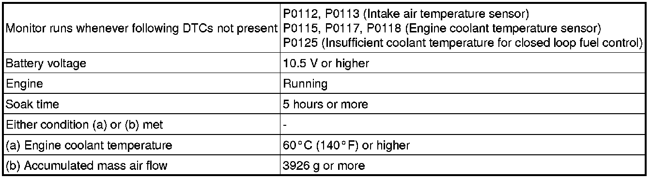 If the engine coolant temperature sensor value does not change after the warmed up engine is stopped and then the next cold engine start is performed, it is determined that a malfunction has occurred. If this is detected in 2 consecutive driving cycles, the MIL is illuminated and a DTC is stored.