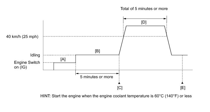 14. Drive the vehicle at 40 km/h (25 mph) or more for a total of 5 minutes or more [D].