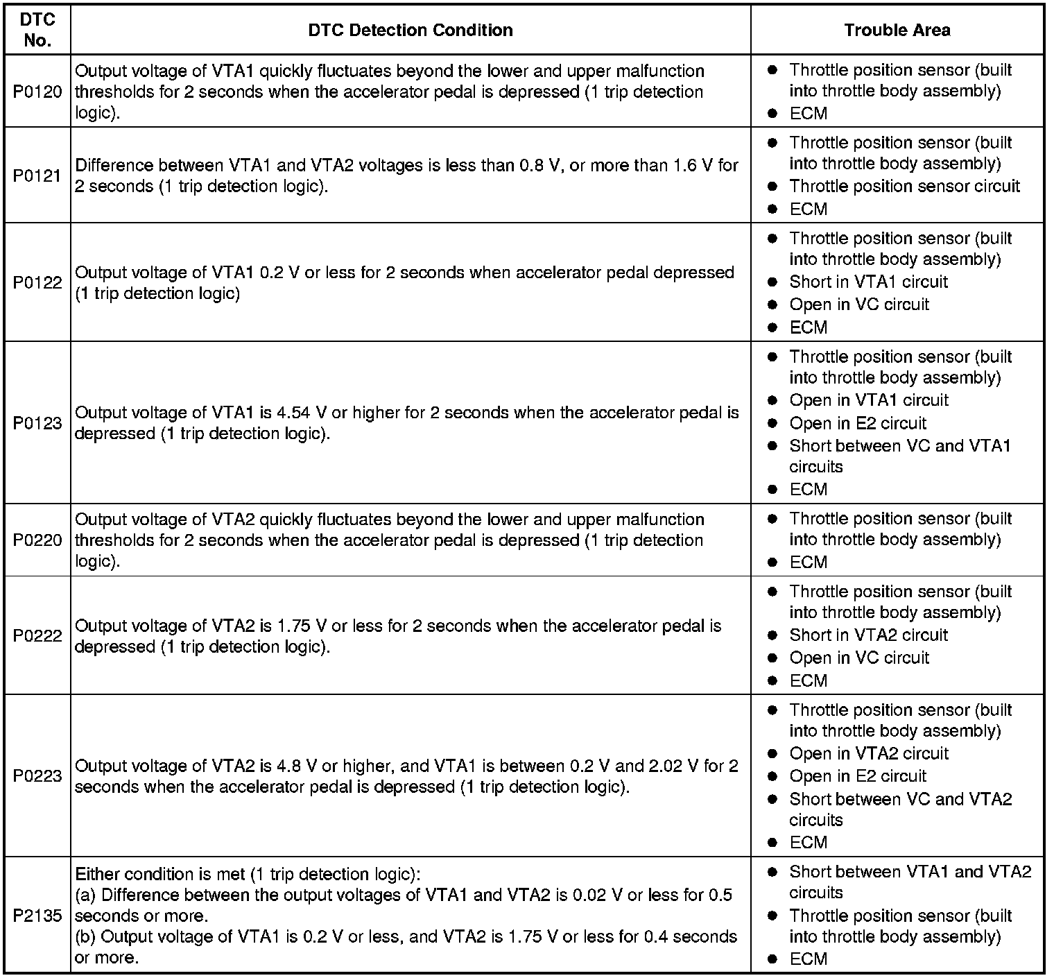 - A specific voltage difference is expected between the sensor terminals, VTA1 and VTA2, for each throttle valve opening angle. If the difference between VTA1 and VTA2 is incorrect, the ECM interprets this as a malfunction in the sensor and stores a DTC.