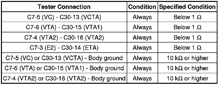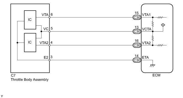 The throttle position sensor has 2 sensor circuits, each of which transmits a signal, VTA1 and VTA2. VTA1 is used to detect the throttle valve angle and VTA2 is used to detect malfunctions in VTA1. The sensor signal voltages vary between 0 V and 5 V in proportion to the throttle valve opening angle, and are transmitted to the VTA terminals of the ECM.