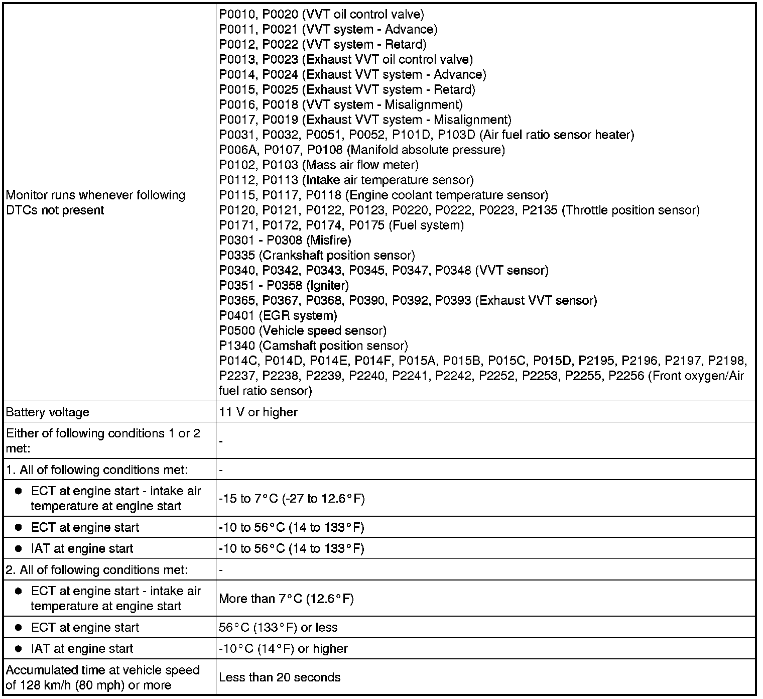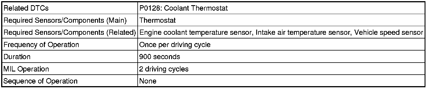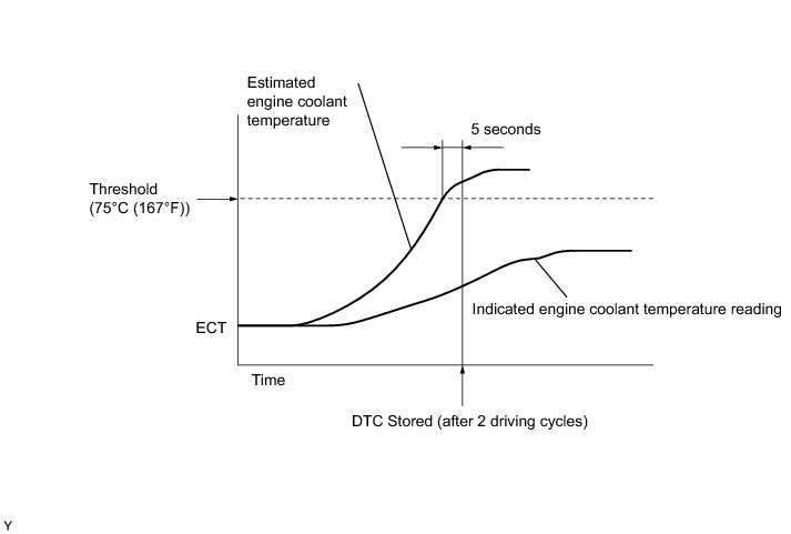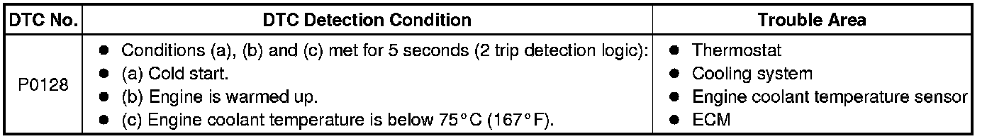 This DTC is stored when the engine coolant temperature does not reach 75°C (167°F) despite sufficient engine warm up time having elapsed.