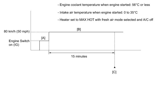 7. Start the engine and drive the vehicle at 80 km/h (50 mph) for 15 minutes [B].