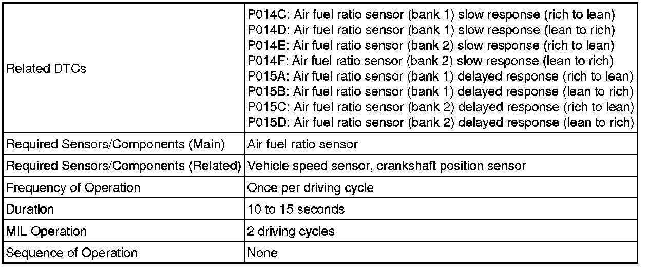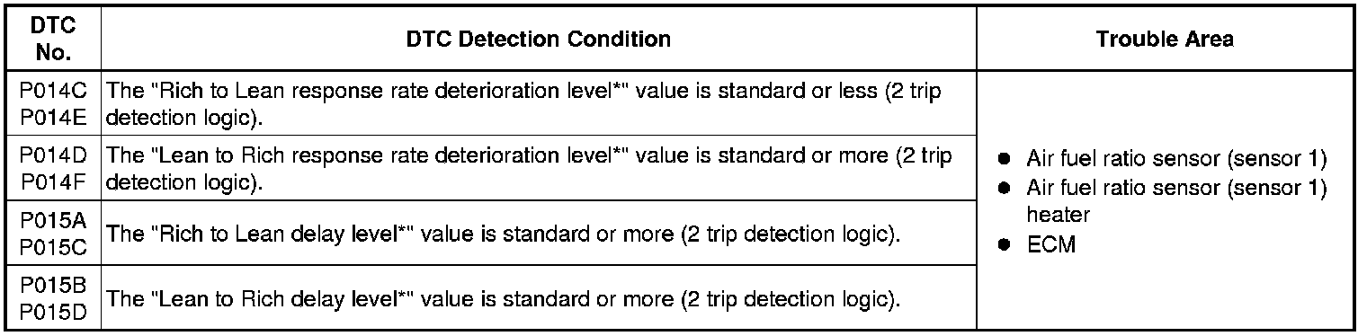 If the time it takes the air fuel ratio sensor output to change is delayed, DTCs P015A, P015B, P015C and P015D are stored.