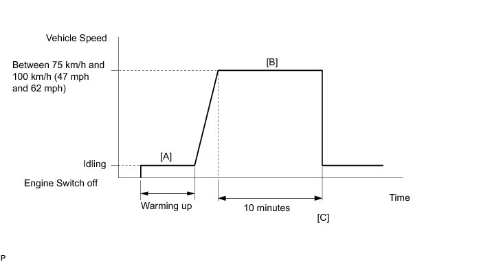 10. Drive the vehicle at a constant speed between 75 and 100 km/h (47 and 62 mph) for 10 minutes [B].