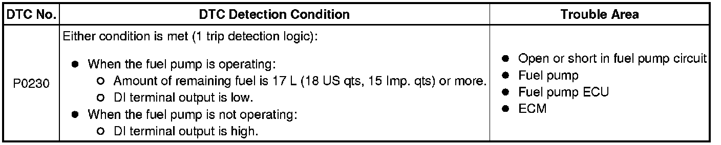 When a malfunction in the fuel pump circuit is detected, DTC P0230 is stored.