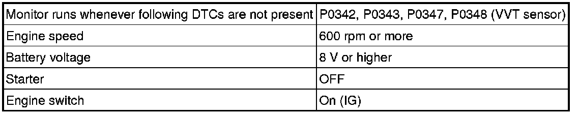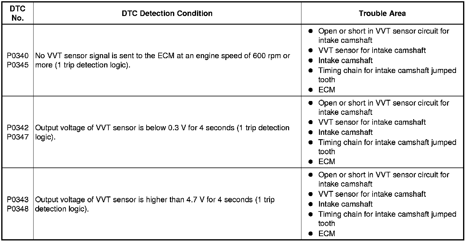 If no signal is transmitted by the VVT sensor despite the engine running, or the rotations of the camshaft and crankshaft are not synchronized, the ECM interprets this as a malfunction of the sensor.
