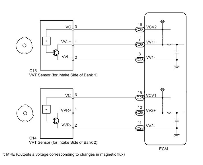The intake camshaft VVT sensor (VV1 and VV2 signal) consists of a magnet and MRE (Magnetoresistive Element).