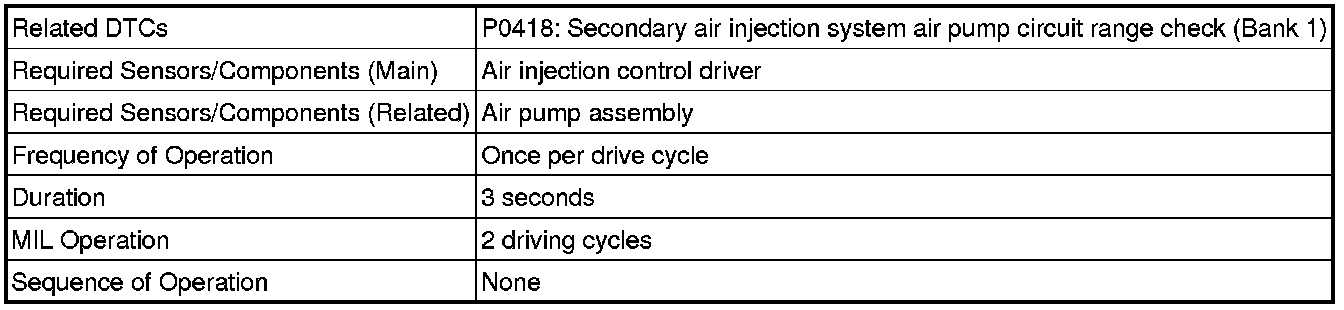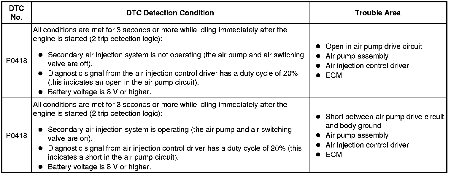 This DTC indicates an open or short circuit in the circuit containing the air pump of the secondary air injection system. The air injection control driver performs diagnosis of the air pump, air switching valve and itself, and sends the results of this diagnosis to the ECM as a duty signal. When the ECM receives a signal indicating a malfunction in the air pump, air switching valve or air injection control driver, it illuminates the MIL and stores a DTC.
