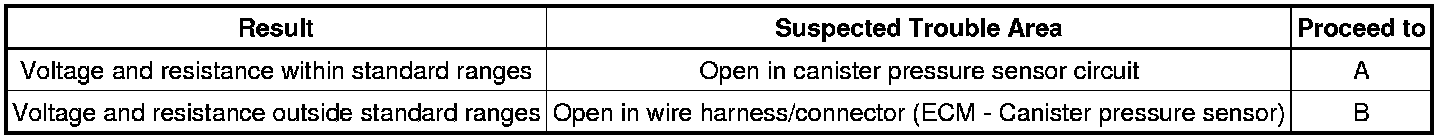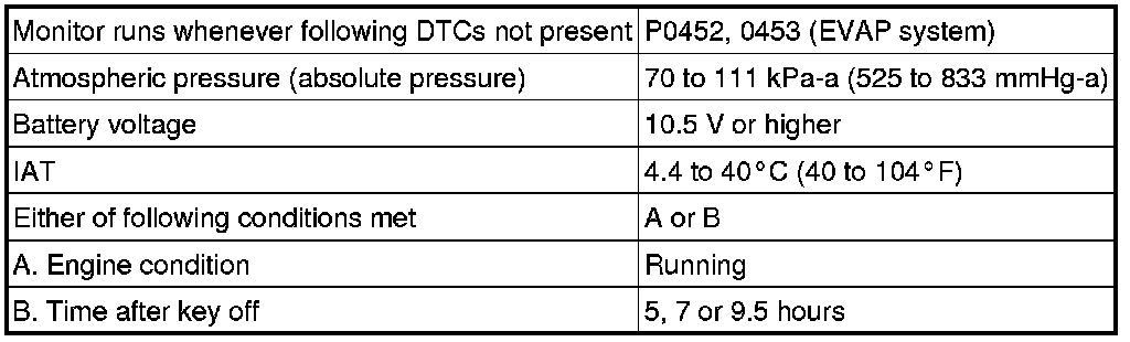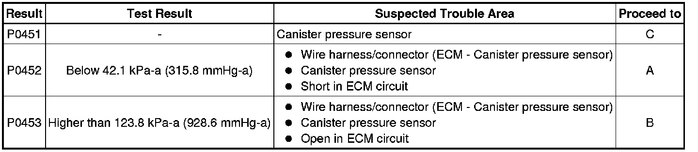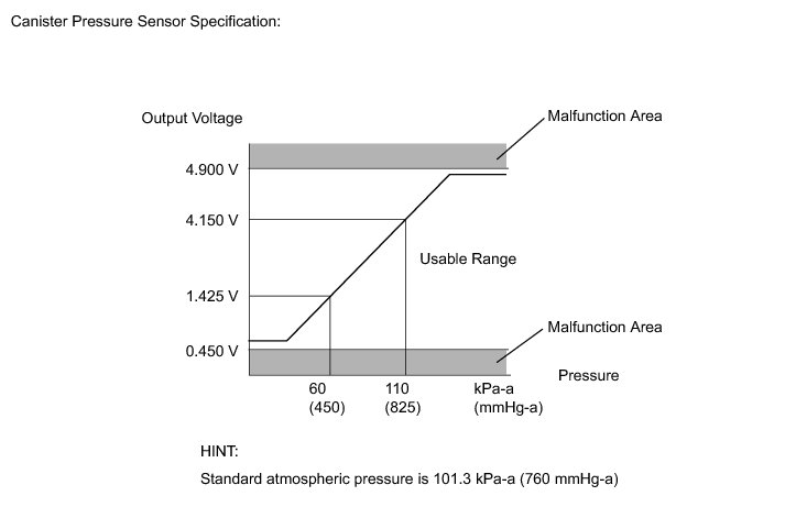 If the canister pressure sensor output [pressure] is below 42.1 kPa-a (315.9 mmHg-a), the ECM interprets this as an open or short circuit malfunction in the canister pressure sensor or its circuit and stops the EVAP system monitor. The ECM then illuminates the MIL and stores the DTC (1 trip detection logic).