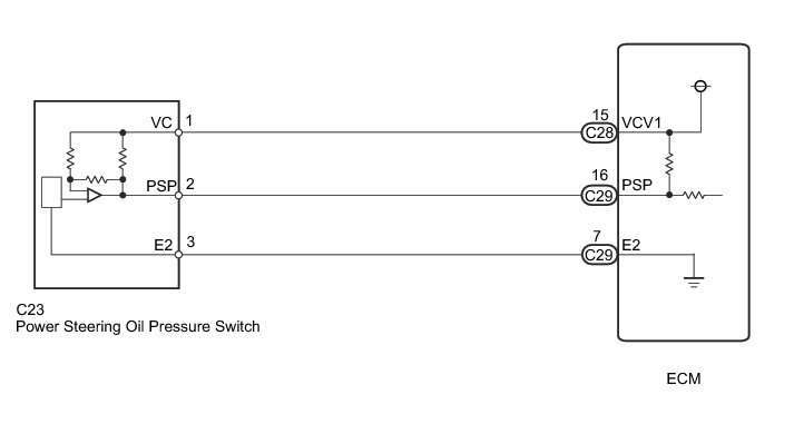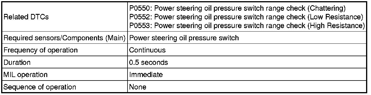The ECM monitors the switch voltage and uses this value to regulate the engine idling speed. When the sensor output voltage deviates from the normal operating range, the ECM determines that there is a malfunction in the power steering oil pressure switch and stores a DTC.