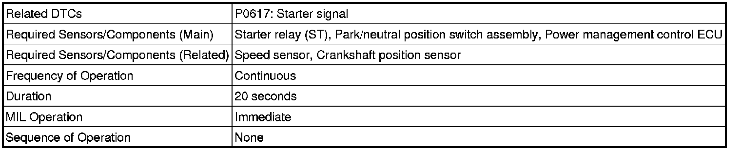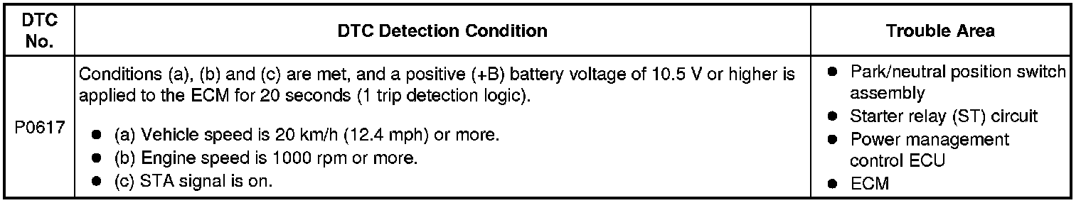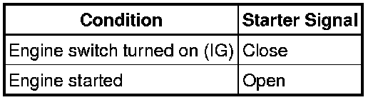 While the engine is being cranked, the positive battery voltage is applied to terminal STA of the ECM. If the ECM detects the starter control (STA) signal while the vehicle is being driven, it determines that there is a malfunction in the STA circuit. The ECM then illuminates the MIL and stores the DTC.