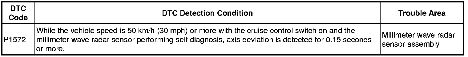 When the millimeter wave radar sensor assembly beam axis has deviated, the ECM detects this and stores DTC P1572.