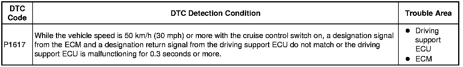 In the dynamic radar cruise control system, the ECM and driving support ECU communicate with one another to control the system based on certain designation information. If the designation information of the ECM and driving support ECU are different or the driving support ECU is malfunctioning, this DTC is stored.