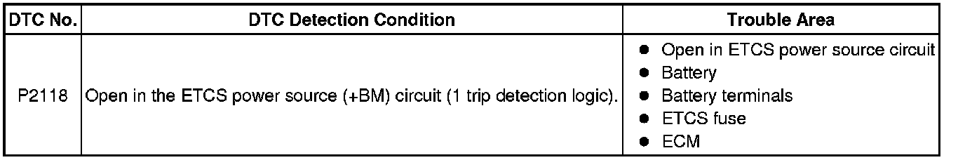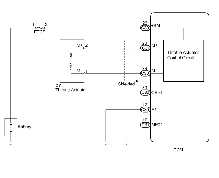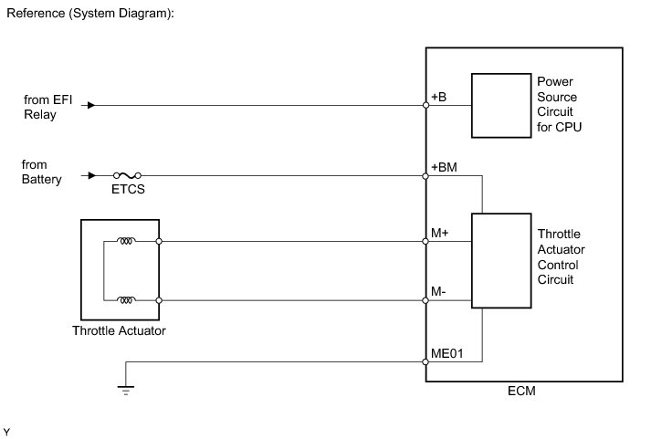 The ETCS (Electronic Throttle Control System) has a dedicated power supply circuit. The voltage (+BM) is monitored and when it is low (below 4 V), the ECM determines that there is a malfunction in the ETCS and cuts off the current to the throttle actuator.