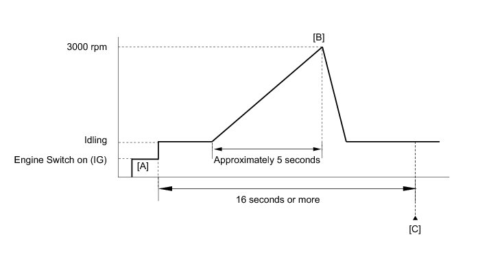7. Slowly depress the accelerator pedal, raise the engine speed to approximately 3000 rpm over approximately 5 seconds, and then idle the engine [B].