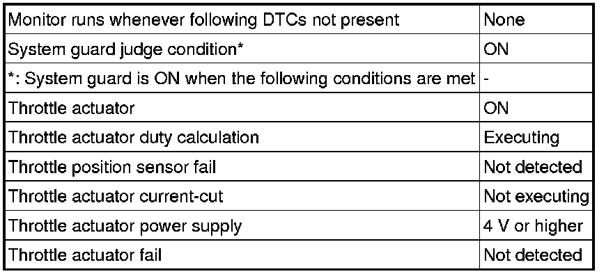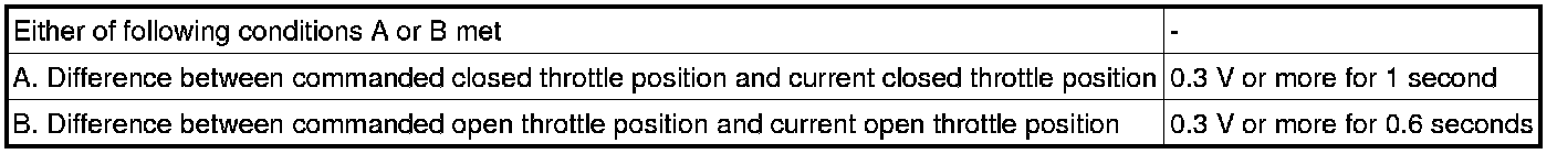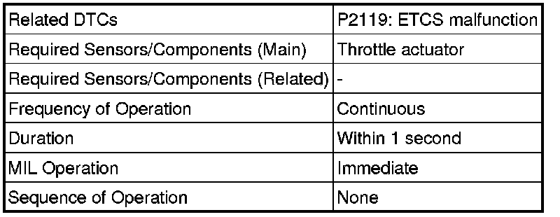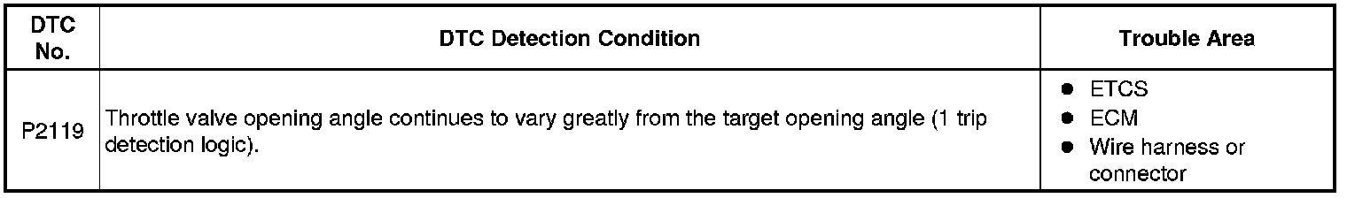 The ECM determines the actual opening angle of the throttle valve from the throttle position sensor signal. The actual opening angle is compared to the target opening angle calculated by the ECM. If the difference between these two values is outside the standard range, the ECM interprets this as a malfunction in the ETCS. The ECM then illuminates the MIL and stores the DTC.