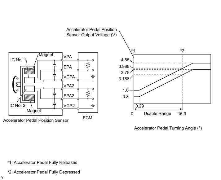 The accelerator pedal position sensor assembly is mounted on the accelerator pedal bracket and has 2 sensor circuits: VPA (main) and VPA2 (sub). This sensor is a non-contact type and uses Hall-effect elements in order to yield accurate signals even in extreme driving conditions, such as at high speeds as well as very low speeds. The voltage, which is applied to terminals VPA and VPA2 of the ECM, varies between 0.5 V and 4.5 V in proportion to the position of the accelerator pedal (throttle valve). The signal from VPA indicates the actual accelerator pedal position (throttle valve opening angle) and is used for engine control. The signal from VPA2 conveys the status of the VPA circuit and is used to check the accelerator pedal position sensor itself.