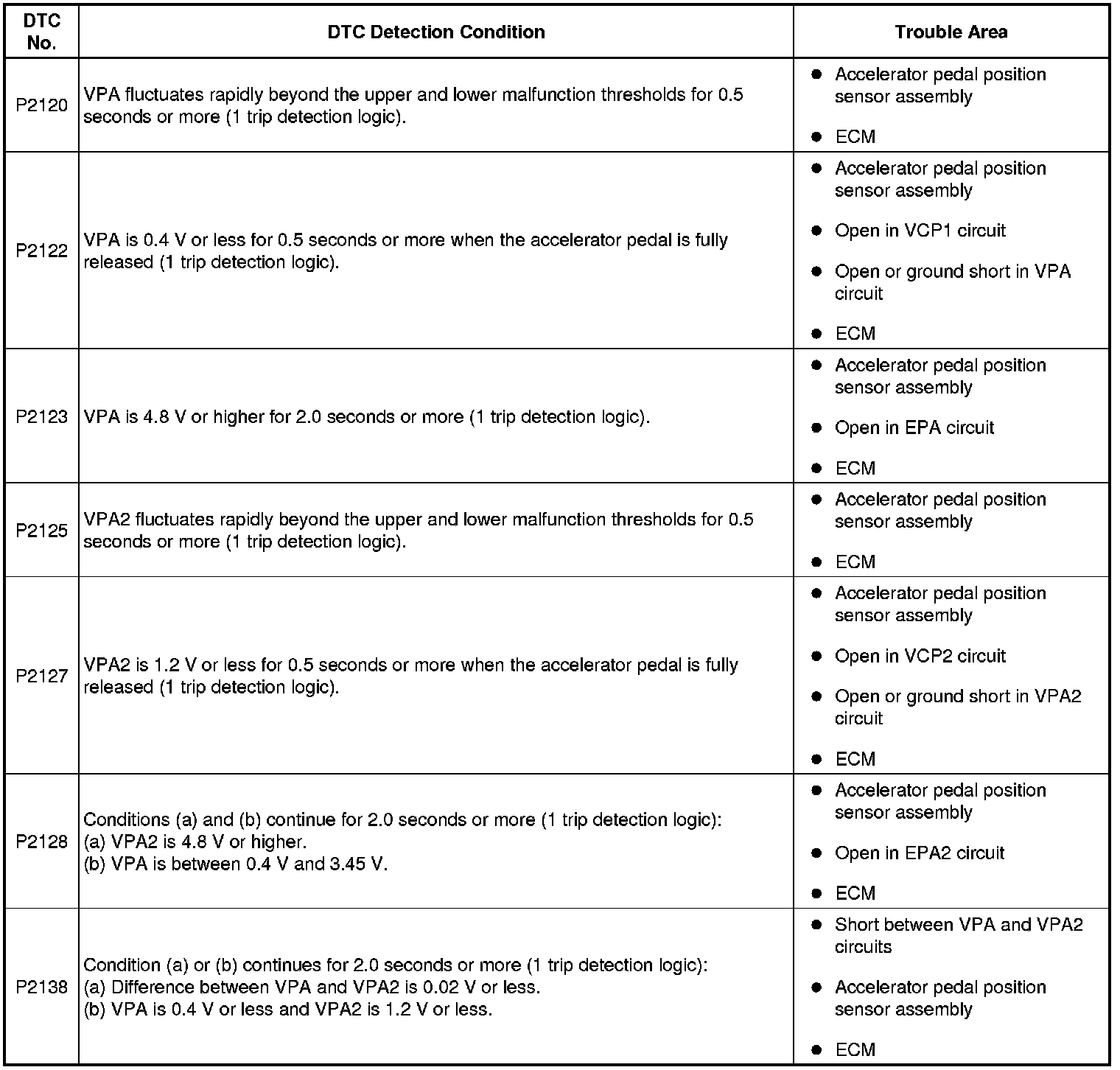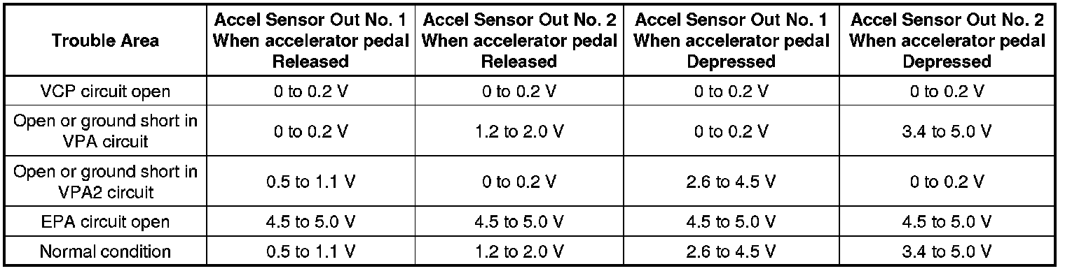 When the output voltage of VPA drops below 0.4 V for more than 0.5 seconds when the accelerator pedal is fully depressed, DTC P2122 is stored.