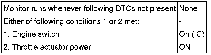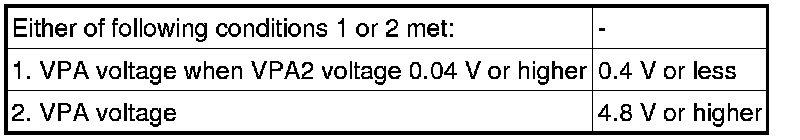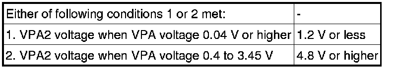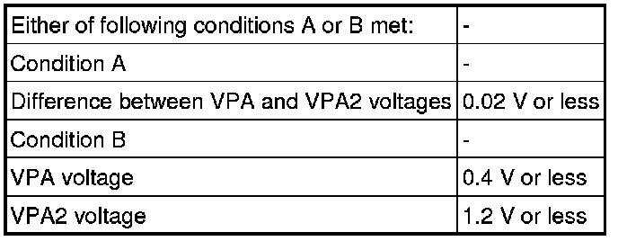 When the output voltage of either VPA or VPA2 deviates from the standard range, or the difference between the output voltages of the 2 sensor circuits is less than the threshold, the ECM determines that there is a malfunction in the accelerator pedal position sensor. The ECM then illuminates the MIL and stores a DTC.