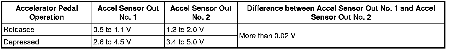 When any of these DTCs are stored, check the accelerator pedal position sensor voltage by entering the following menus: Powertrain / Engine and ECT / Data List / All Data / Accel Sensor Out No. 1 and Accel Sensor Out No. 2.