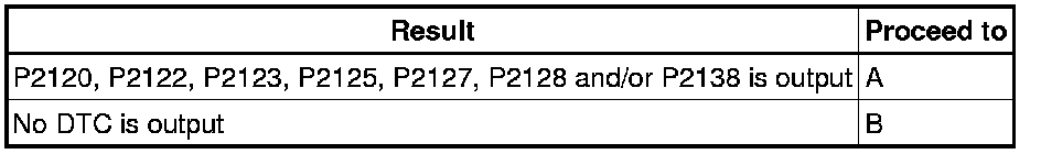 When DTC P2120, P2121, P2122, P2123, P2125, P2127, P2128 or P2138 is stored, the ECM enters fail-safe mode. If either of the 2 sensor circuits malfunctions, the ECM uses the remaining circuit to calculate the accelerator pedal position to allow the vehicle to continue driving. If both of the circuits malfunction, the ECM regards the accelerator pedal as being released. As a result, the throttle valve is closed and the engine idles.