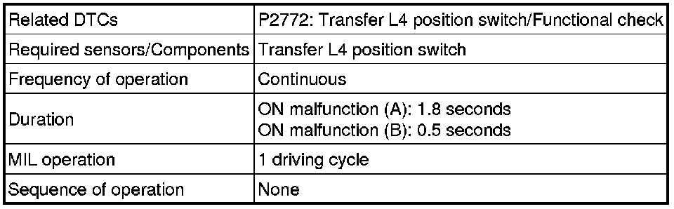 The ECM monitors the transfer-case L4 position switch to determine when the transfer-case L4 gears are engaged. If the L4 position switch indicates that the transfer-case L4 gears are engaged under the following conditions, the ECM will conclude that there is a malfunction of the L4 position switch, illuminate the MIL and store the DTC: