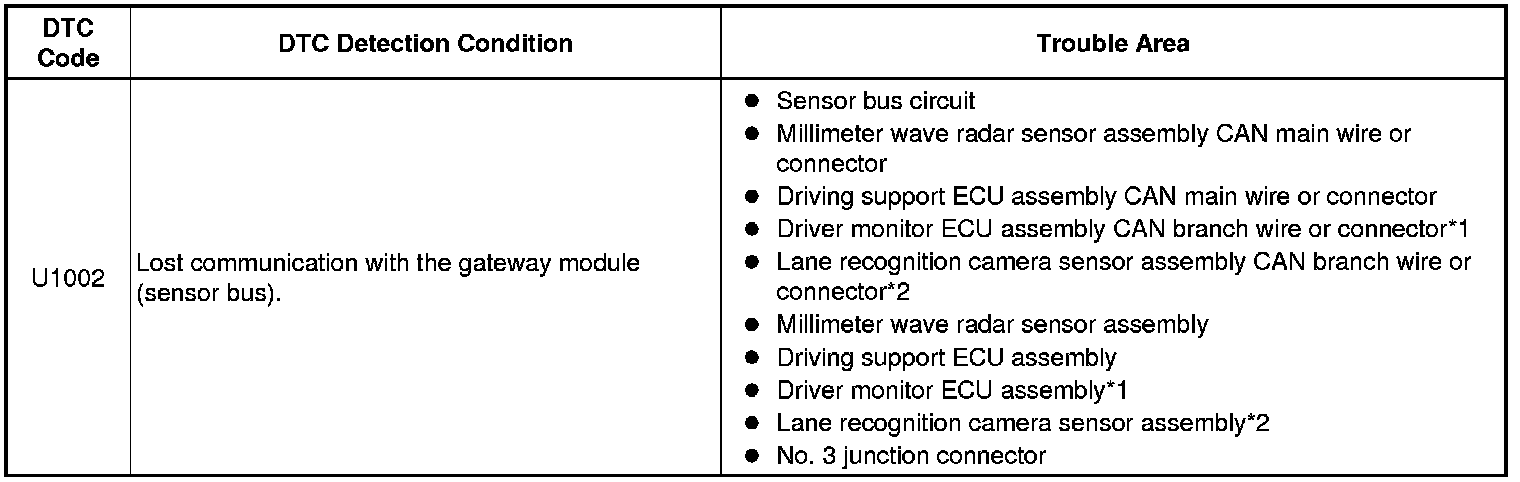 * The driving support ECU assembly stores this DTC when no signals can be received from the ECUs that have been memorized as those connected to the sensor bus.