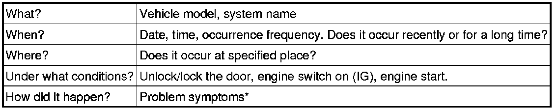 * *: Be sure to ask the customer in detail about the following points concerning the vehicle operating conditions, environment and problem, and then check for DTCs.