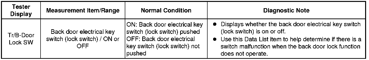 If the entry lock function does not operate for the back door only, but the entry unlock function operates, the request code is being transmitted properly from the back door. In this case, there may be a problem related to the lock switch (connection between the back door electrical key switch and certification ECU).