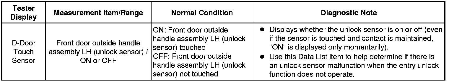5. CHECK FRONT DOOR OUTSIDE HANDLE ASSEMBLY LH (DRIVER SIDE DOOR UNLOCK SENSOR SIGNAL INPUT)