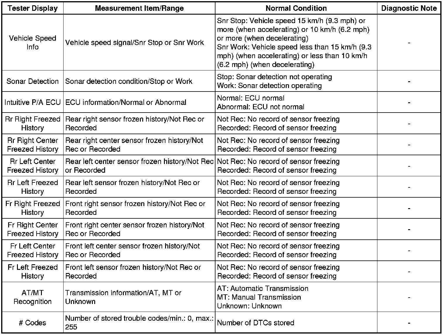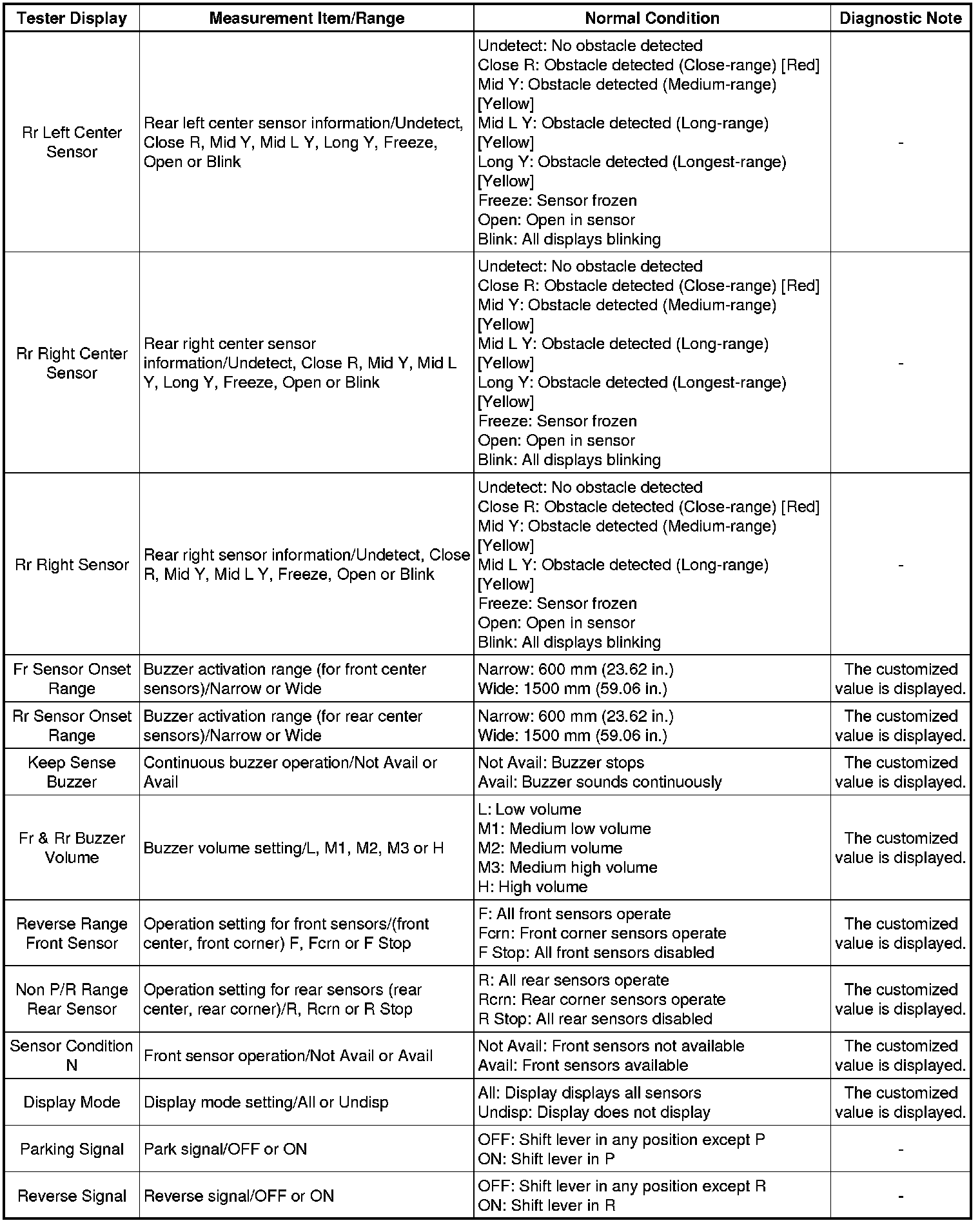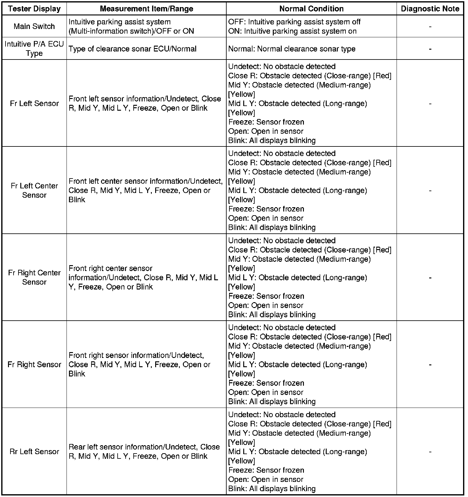 PARK ASSIST / MONITORING: INTUITIVE PARKING ASSIST SYSTEM: DATA LIST / ACTIVE TEST