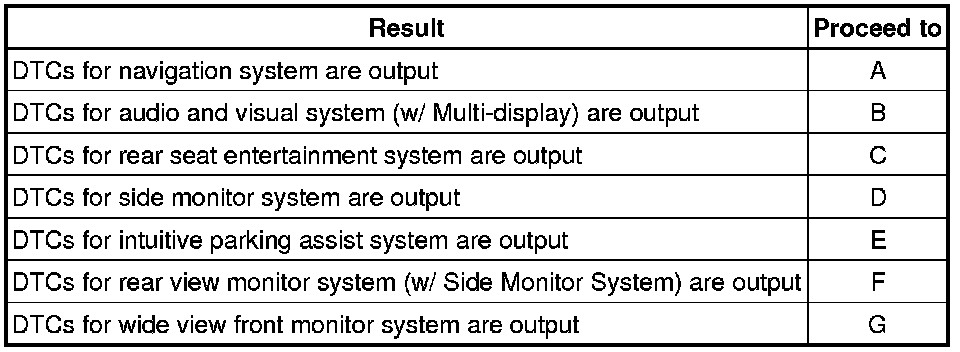 The navigation system outputs DTCs for the following systems. When DTCs other than those in Diagnostic Trouble Code Chart for the navigation system are output, refer to Diagnostic Trouble Code Chart for the appropriate system.