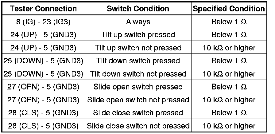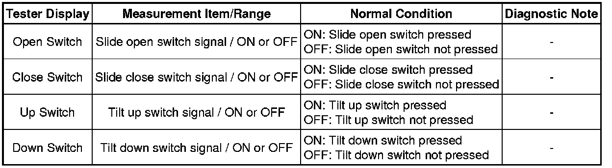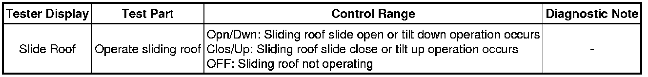(a) Select the Active Test, use the Techstream to generate a control command, and then check that the sliding roof slides open/closed and tilts up/down Scan Tool Testing and Procedures.