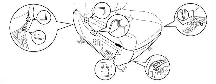 (d) Move the cushion shield in the direction of the arrow to detach the clip and remove the front seat No. 1 inner cushion shield together with the cushion shield as a unit.