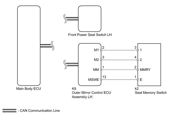 The main body ECU receives seat memory switch signals from the outer mirror control ECU via CAN communication. If the SET switch is being pressed when one of the M1 or M2 switches is pressed, or if one of the M1 or M2 switches is pressed within 3 seconds of pressing the SET switch, the main body ECU sends a memory request signal to the front power seat switch LH. After receiving the request signal, the front power seat switch LH memorized location data of each motor.
