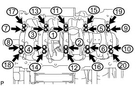 Uniformly tighten the 20 main bearing cap bolts in the sequence shown in the illustration.