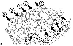 (k) Install and uniformly tighten the 10 main bearing cap bolts and 10 new seal washers in several steps in the sequence shown in the illustration.