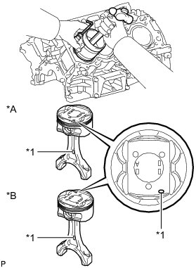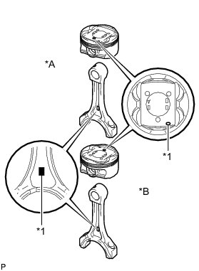 For the LH side, perform the assembly so that the front marks of the piston and connecting rod are on the same side. For the RH side, perform the assembly so that the front marks of the piston and connecting rod are on opposite sides.