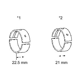 Main bearings come in widths of 21 mm (0.827 in.) and 22.5 mm (0.886 in.). Install the 22.5 mm (0.886 in.) bearings in the No. 1 and No. 5 cylinder block journal positions with the main bearing caps. Install the 21 mm (0.827 in.) bearings in the No. 2, No. 3 and No. 4 positions.