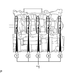 (b) Confirm the front marks and numbers of the main bearing caps and install the bearing caps to the cylinder block.