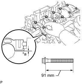 (e) Insert the main bearing cap by hand until the clearance between the main bearing cap and cylinder block is less than 6 mm (0.236 in.) and partially tighten the 2 inner bearing cap bolts.