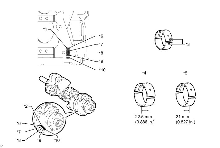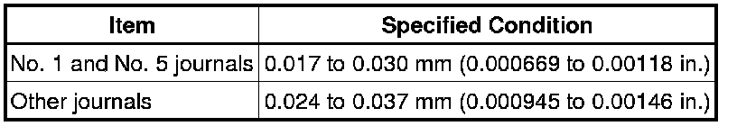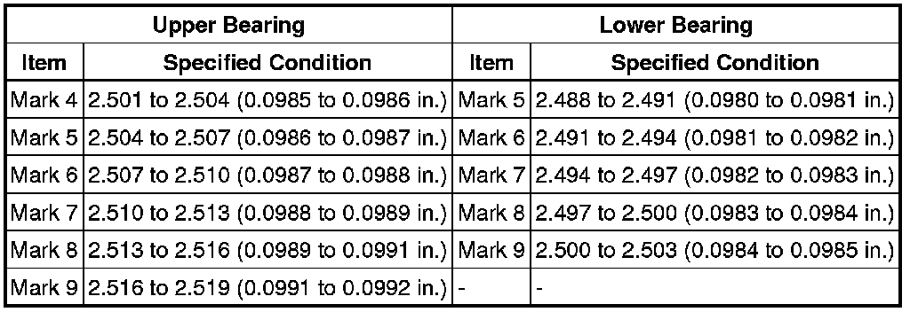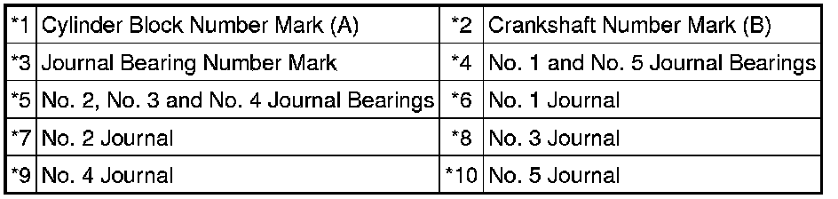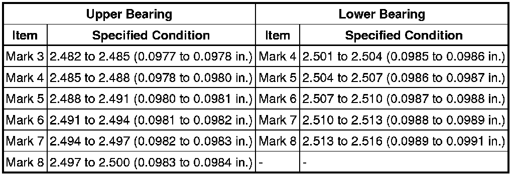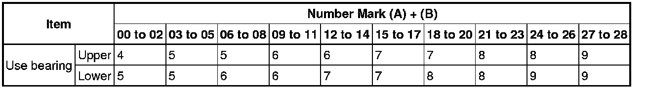 If replacing a bearing, replace it with one that has the same number. If the number of the bearing cannot be determined, select the correct bearing by adding together the numbers imprinted on the cylinder block and crankshaft. Refer to the table below for the appropriate bearing number. There are 6 sizes of standard bearings. For the No. 1 and No. 5 position bearings, use bearings marked 4, 5, 6, 7, 8 and 9. For other bearings, use bearings marked 3, 4, 5, 6, 7 and 8.