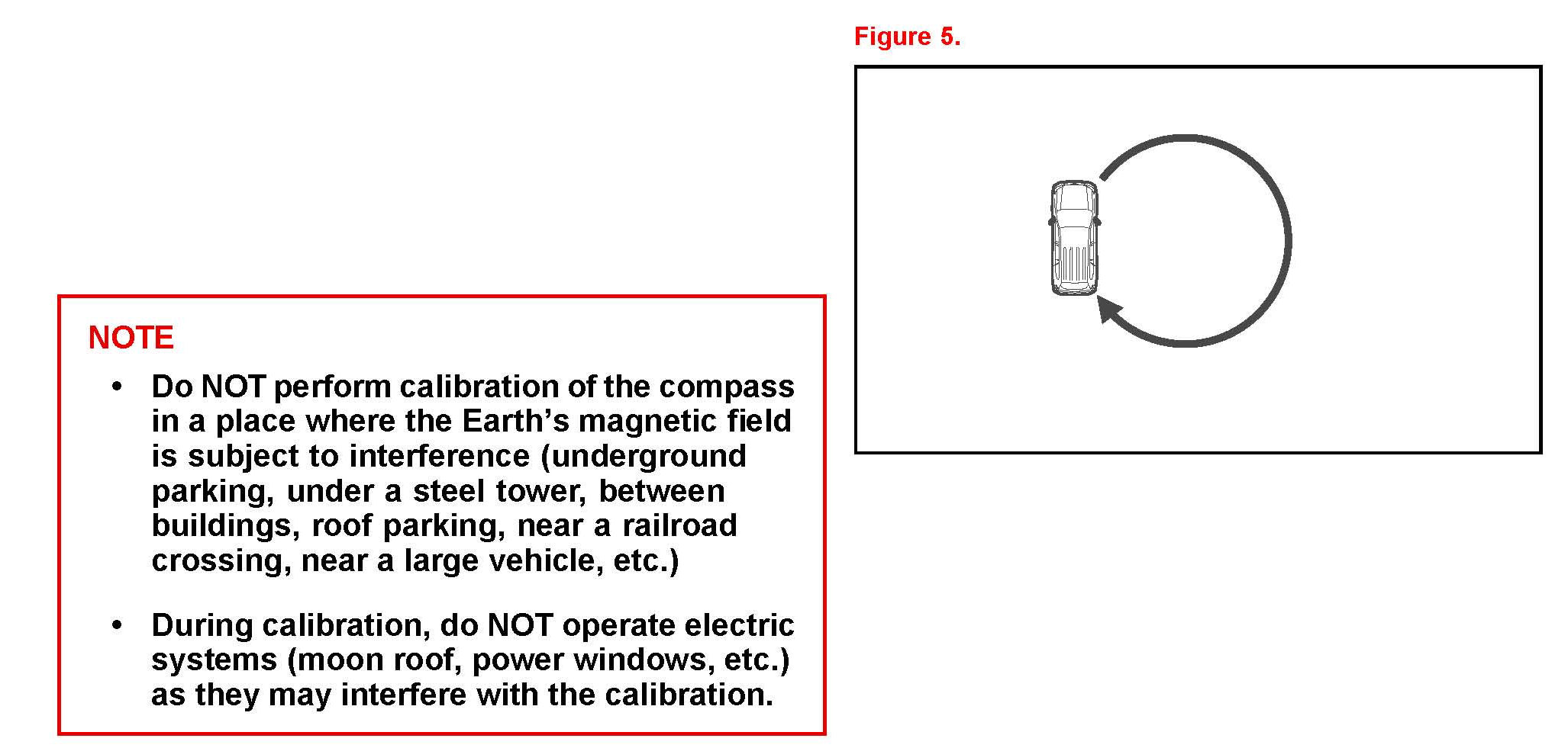 4. Drive the vehicle slowly at 5 mph (8 km/h), or less, in a circle until the direction is displayed. If there is NOT enough space to drive in a circle, drive around the block until the direction is displayed.