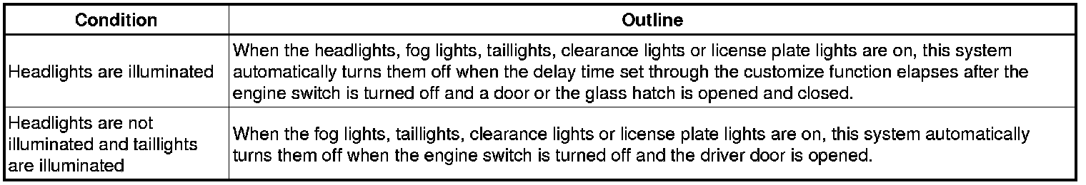 The light auto turn-off system is used to prevent the driver from leaving the vehicle with the headlights, fog lights, taillights, clearance lights or license plate lights on.