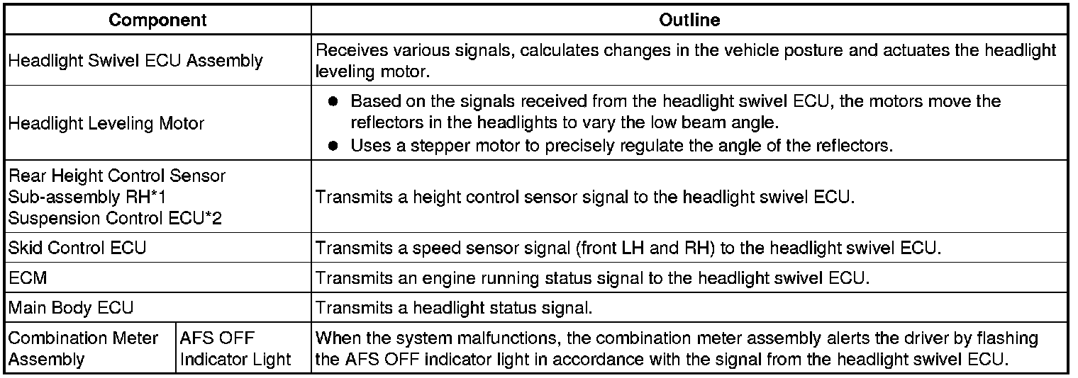 When the low beam headlights are on, the automatic headlight beam level control system operates the headlight leveling motor in accordance with the movement of the vehicle. The headlight swivel ECU controls the system.