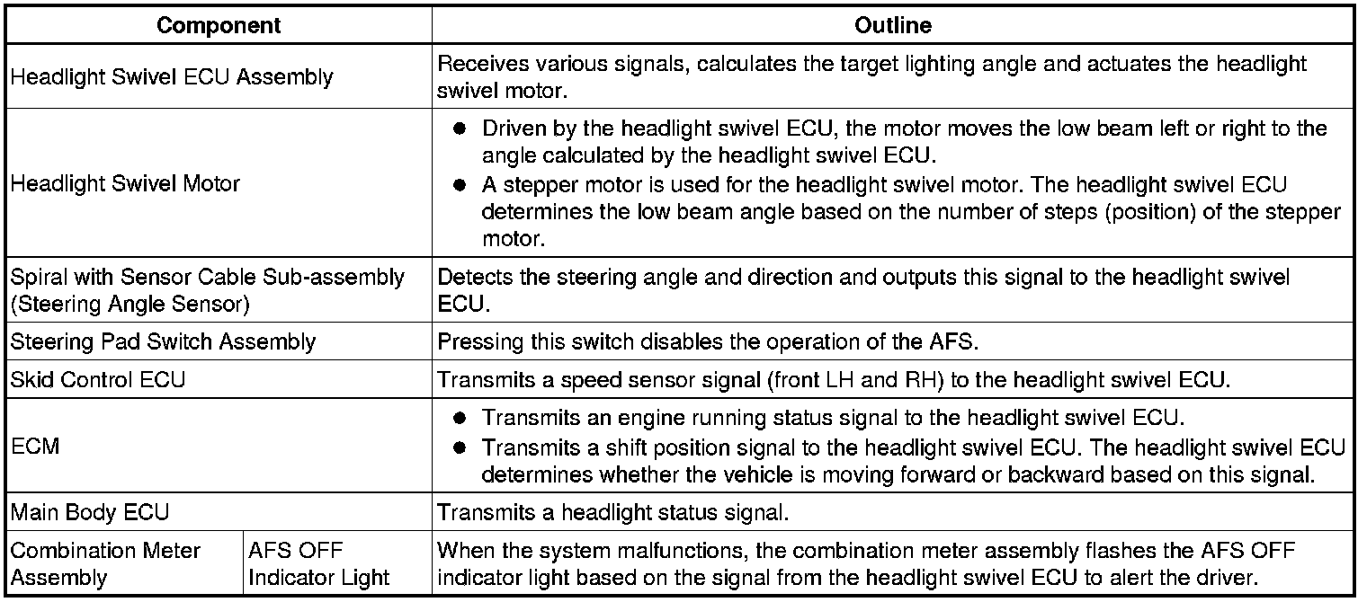 * The AFS uses medium-to-high speed control and low speed control. In medium-to-high speed control, the system calculates the target lighting angle based on the steering angle and vehicle speed and changes the swivel angle of the low beam headlights individually. During low speed control, the system calculates the target lighting angle based on the steering angle and changes the swivel angle of the low beam headlight on the side facing into the turn.